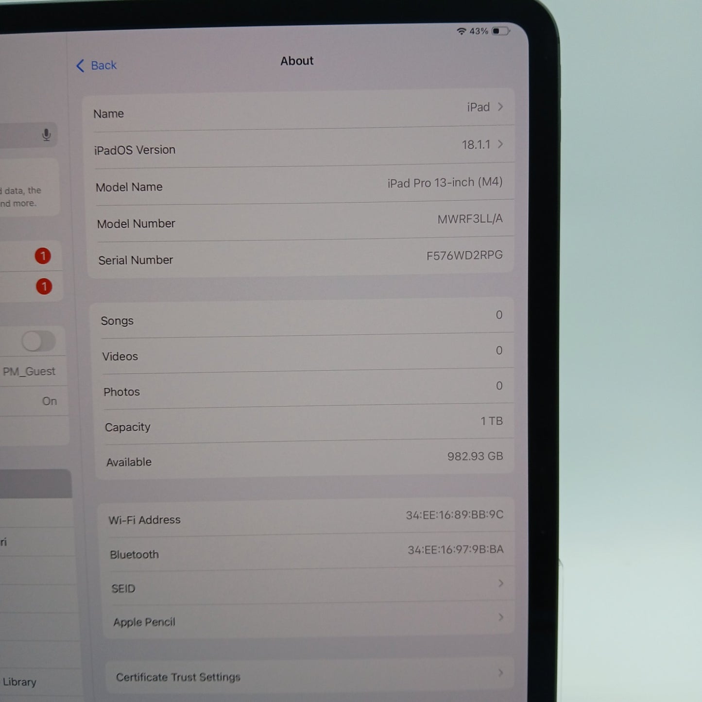 WiFi Only Apple iPad Pro 13" M4 1TB 18.1.1 Space Gray MWRF3LL/A